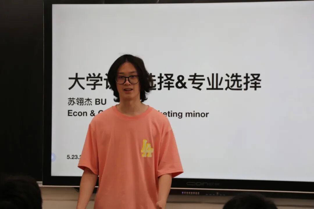现就读于波士顿大学,双专业为经济与计算机科学,辅修市场营销,他的分享主题是大学课程选择和专业选择。他详细讲解了如何平衡不同课程和专业的学习,鼓励大家多尝试,找到最适合自己的方向。